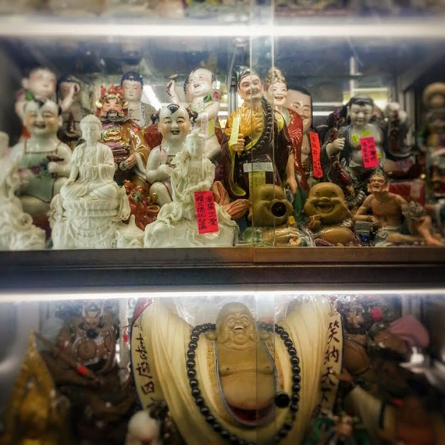 A glass Curio Cabinet stuffed full of goddesses, buddhas, devils and warriors...